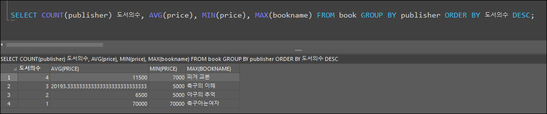 출판사 컬럼을 Group by로 묶어주어 아래와 여러 데이터 표현 가능